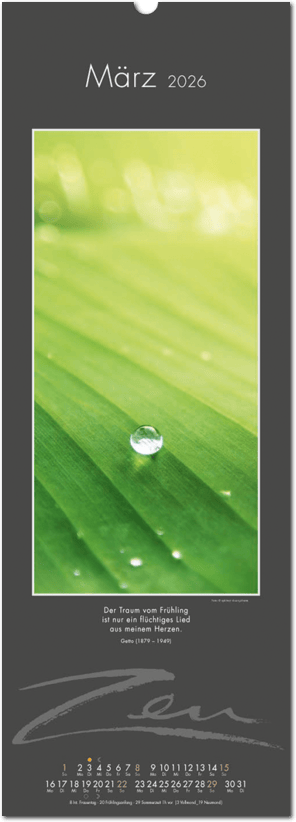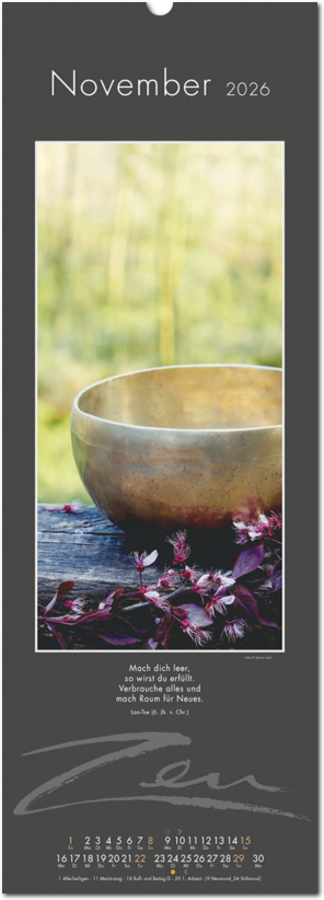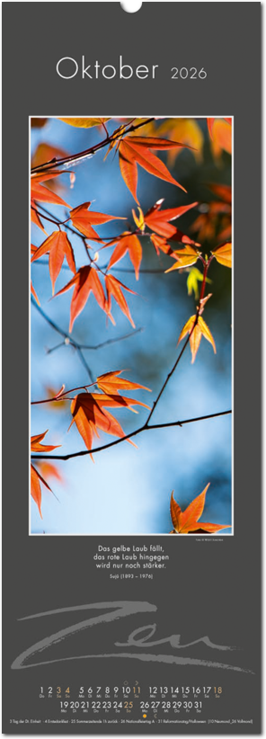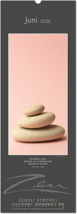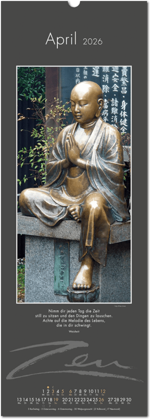 Weniger ist mehr. Der elegante Zen-Kalender im reduzierten Japanstil überzeugt durch schlichte und zugleich ausdrucksstarke Bilder, die zum Verweilen und Innehalten einladen. Die Einfachheit von Zen wird in eine poetische Bildsprache umgesetzt. Der Blick richtet sich auf das Schlichte und Unscheinbare und lässt es in seiner ganzen Schönheit erstrahlen. Ob blühende Zweige im Frühling, filigrane Gräser im Wind oder ein meditativer Zen-Garten – der Kalender erzählt von der Kunst des Weglassens und der Besinnung auf das Wesentliche. Die Bilder finden ihre lyrische Ergänzung durch Haikus oder Zen-Gedichte von japanischen Dichtern. Ein Kalender, der Harmonie, Ruhe und Ausgeglichenheit ausstrahlt.
