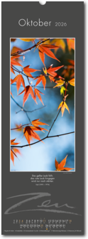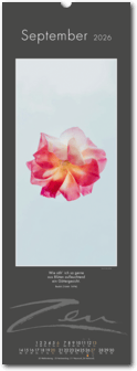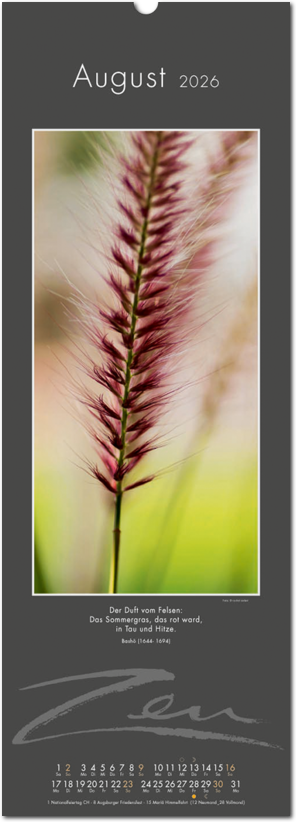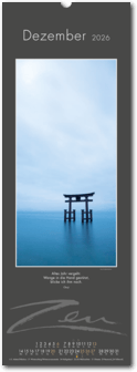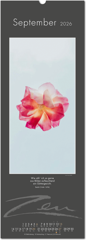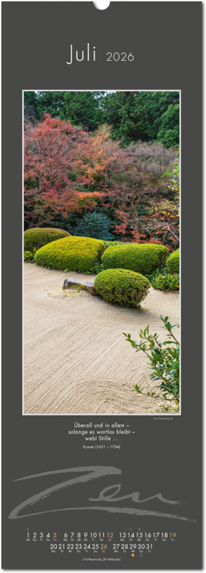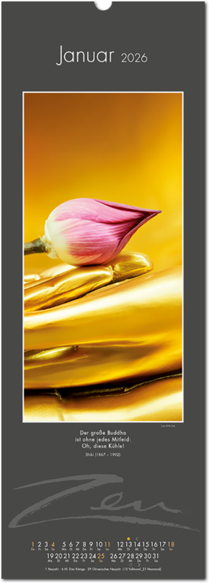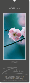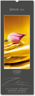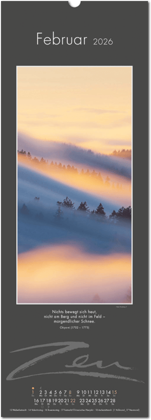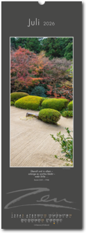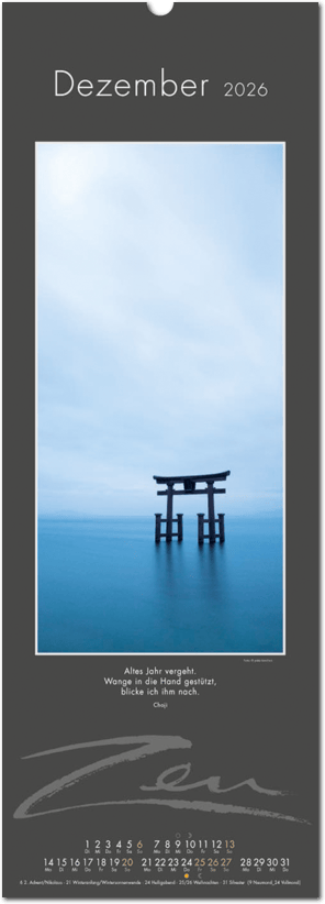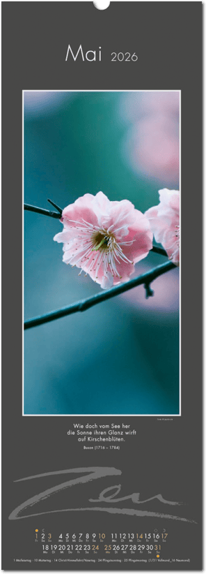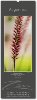 Weniger ist mehr. Der elegante Zen-Kalender im reduzierten Japanstil überzeugt durch schlichte und zugleich ausdrucksstarke Bilder, die zum Verweilen und Innehalten einladen. Die Einfachheit von Zen wird in eine poetische Bildsprache umgesetzt. Der Blick richtet sich auf das Schlichte und Unscheinbare und lässt es in seiner ganzen Schönheit erstrahlen. Ob blühende Zweige im Frühling, filigrane Gräser im Wind oder ein meditativer Zen-Garten – der Kalender erzählt von der Kunst des Weglassens und der Besinnung auf das Wesentliche. Die Bilder finden ihre lyrische Ergänzung durch Haikus oder Zen-Gedichte von japanischen Dichtern. Ein Kalender, der Harmonie, Ruhe und Ausgeglichenheit ausstrahlt.